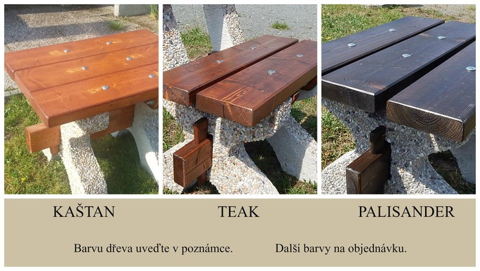 Nábytek je dodáván v barvě dřeva teak, kaštan nebo palisandr a v barvě kamínku šedý nebo žlutý (uveďte do objednávky).
