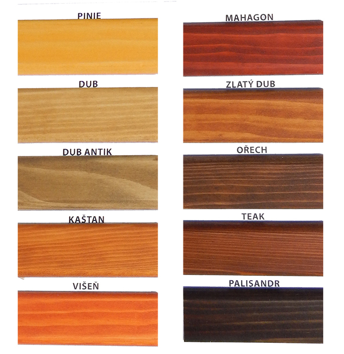 Vzorník. Základní barvy jsou Kaštan, Teak a Palisandr. Ostatní lazury jsou za příplatek 5%. Barvy se mohou lišit dle rozlišení a nastavení monitoru